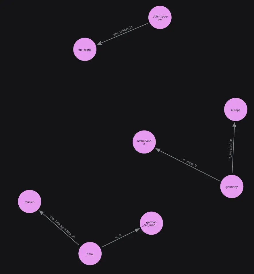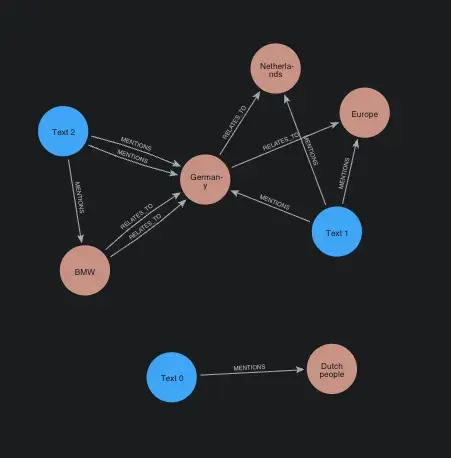 The Cognee knowledge graph also correctly includes all relevant entities. Text chunks and entity types are represented as entities as well. The relationships among entities are correctly and granularly defined on their edges. All three fail to connect Dutch people to the Netherlands, highlighting the limitations of semantic extraction without customization.