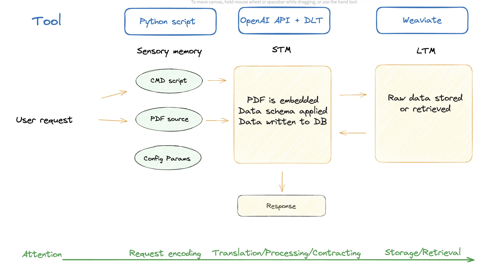 The parallel with our memory components becomes clearer at this stage. We have some way to define inputs which correspond to SM, while STM and LTM are starting to become two separate, clearly distinguishable entities. It becomes evident that we need to separate LTM data according to domains it belongs to but, at this point, a clear structure for how that would work has not yet emerged.