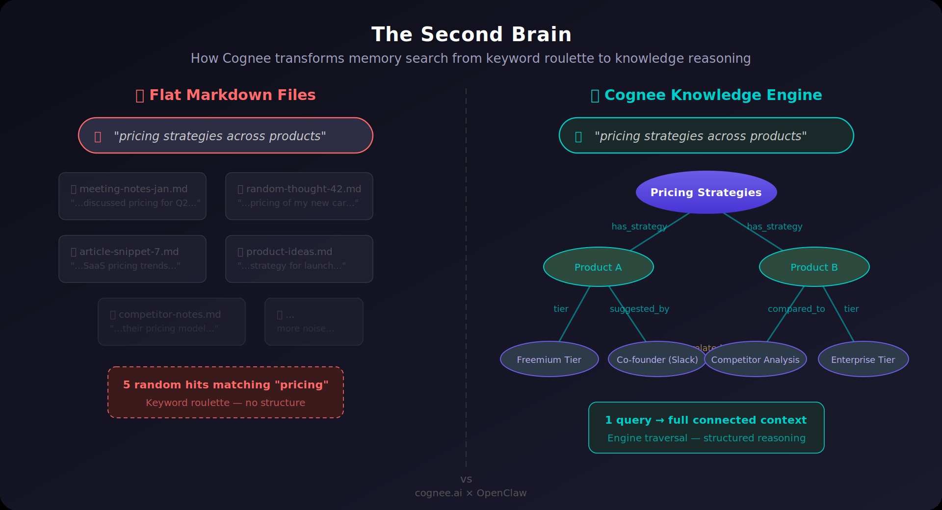 OpenClaw stores memories as flat markdown files. That works fine when you have a dozen notes. But as your Claw accumulates hundreds of interactions, projects, preferences, and context — searching those flat files becomes a game of keyword roulette. Your Claw might "remember" something exists but fail to connect it to what matters right now.