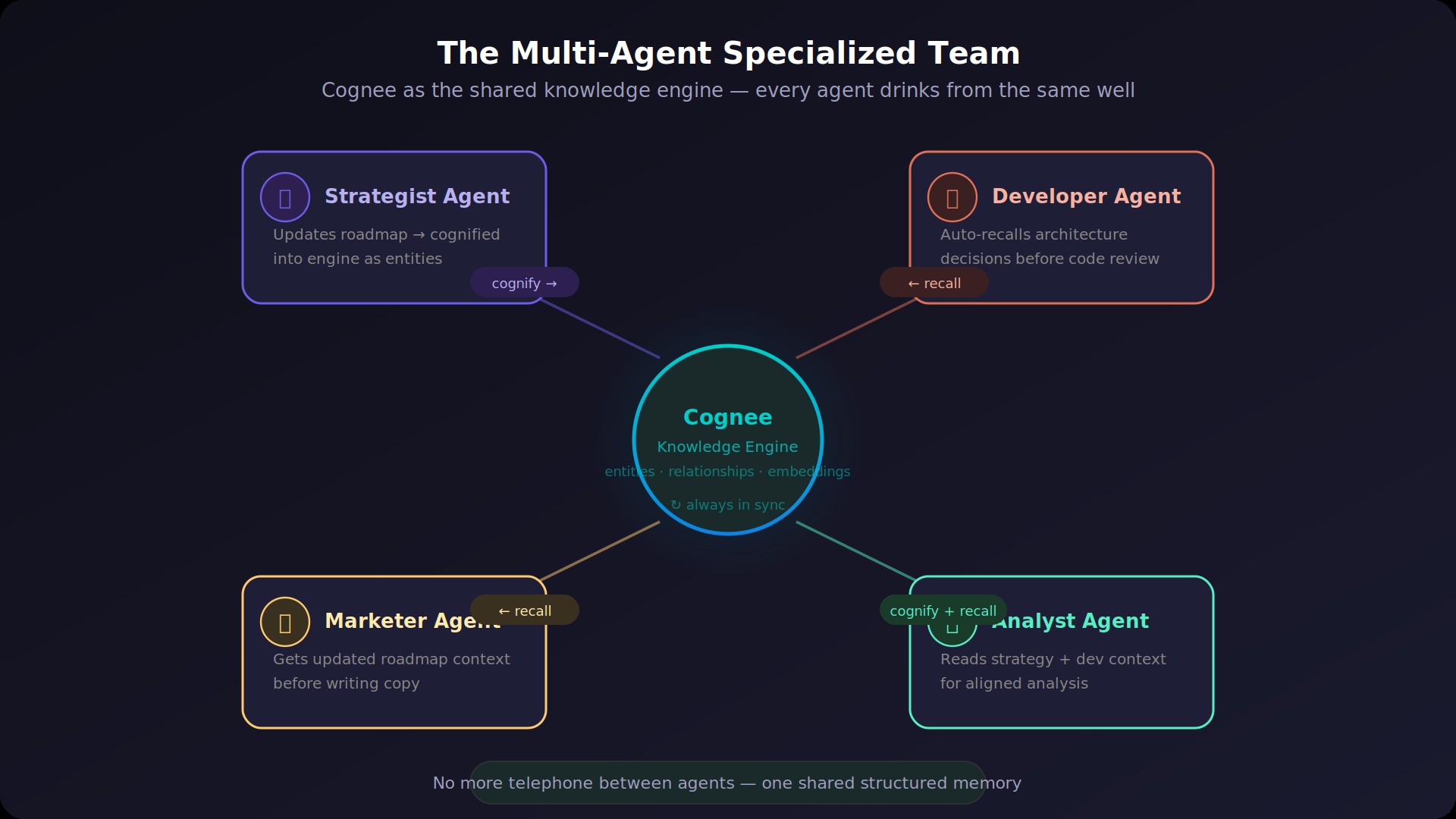 No more telephone. No more stale context. Every agent drinks from the same well of structured knowledge — and Cognee ensures they get the relevant parts, not a dump of everything.