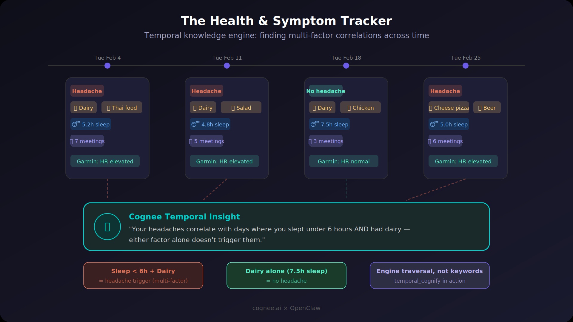 How Cognee rocks it: This is where Cognee's knowledge graph shines brightest. Every food log, symptom report, sleep score, and exercise session becomes a node in the graph with temporal edges (when enabled). Cognee's temporal_cognify adds time-aware relationships, so queries like "What did I eat in the 24 hours before my last three headaches?" become graph traversals, not keyword searches. The Claw can surface patterns you'd never spot manually: "Your headaches correlate with days where you slept under 6 hours AND had dairy — either factor alone doesn't trigger them." That's not a prompt trick. That's structured knowledge reasoning.