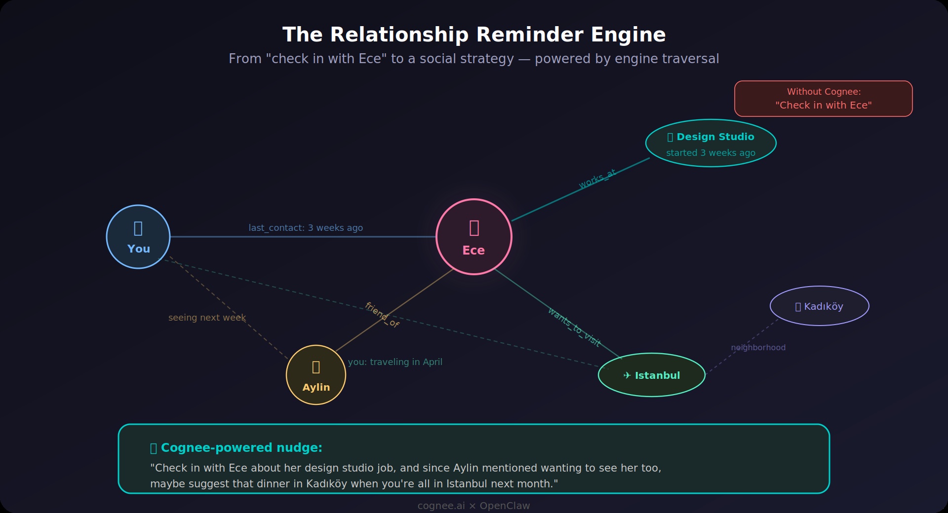 How Cognee makes this radically better: Without Cognee, my Claw searches flat markdown files to find "last interaction with Ece." With Cognee, it traverses a relationship graph: Ece → works at → design studio → started → 3 weeks ago. Ece → friend of → Aylin → who you're seeing next week (so you could coordinate a group dinner). Ece → mentioned → wanting to visit Istanbul → where you'll be in April. The nudge goes from "check in with Ece" to "check in with Ece about her design studio job, and since Aylin mentioned wanting to see her too, maybe suggest that dinner in Kadıköy when you're all in Istanbul next month." That's not a reminder — that's a social strategist.